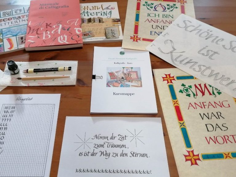 Seit 2009 findet im Müllerhof in Mittweida ein Kalligrafiekurs statt, den ich seit dem auch leite. Mit den alten deutschen Schreibschriften haben wir seinerzeit begonnen. Im Laufe der Zeit wurden die verschiedensten kalligrafischen Schriften gelehrt, gelernt, geübt und angewendet. Viele kalligrafische Werke sind seit dem entstanden, an denen die Teilnehmerinnen und Teilnehmer im Kursverlauf gewachsen sind. Die eigenen Werke spiegeln die Kenntnisse, Fähigkeiten und Fertigkeiten, die sie im Kursverlauf erworben haben, wieder.