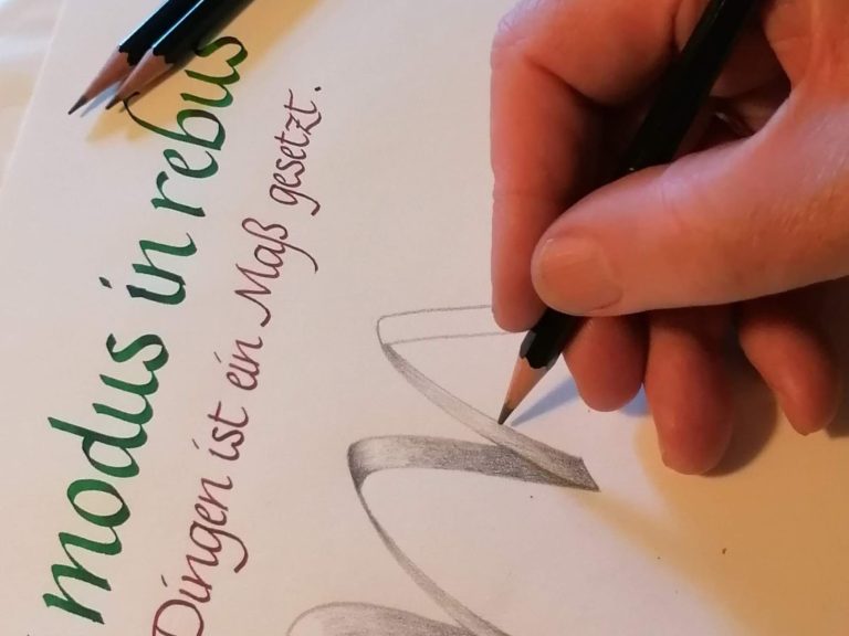 Mit einer kursiven Antiqua haben wir seinerzeit begonnen, die Schrift intensiv geübt und trainiert, Ornamente gezeichnet, Initialen gestaltet und Leporellos angefertigt. Weitere Schriften kamen hinzu, die dann von den Teilnehmerinnen und Teilnehmern bei der Verwirklichung der zahlreichen Kursprojekte ihre Anwendung fanden. Viele kalligrafische Werke sind seit dem entstanden, an denen die Teilnehmerinnen und Teilnehmer im Kursverlauf auch gewachsen sind. Die eigenen Werke spiegeln die Kenntnisse, Fähigkeiten und Fertigkeiten, die sie im Kursverlauf erworben haben, wieder.